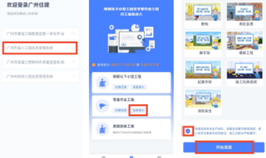 3、账号注册完后,登录账号可选择密码登录或验证码登录,首次登录选择广州市临小工程信息管理系统,进入业务办理页面