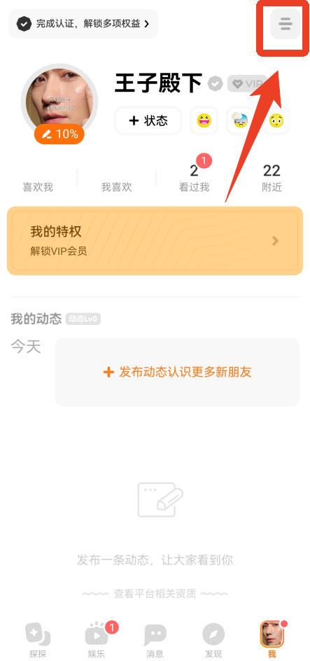 1、来到【我】页面,点击右上角三根横线的图标。