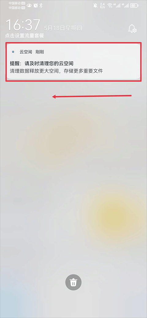 1、当手机弹出云空间通知时,将此通知向左边滑动
