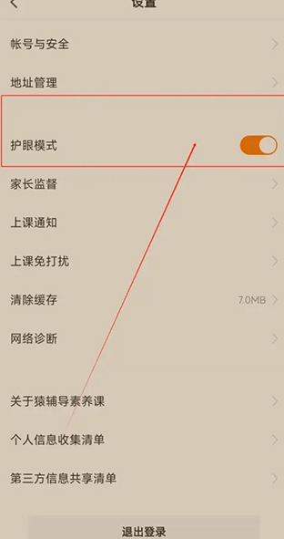 3、在设置界面中,点击“护眼模式”右侧的按钮,当按钮颜色变成橙色,则表示开启该功能成功