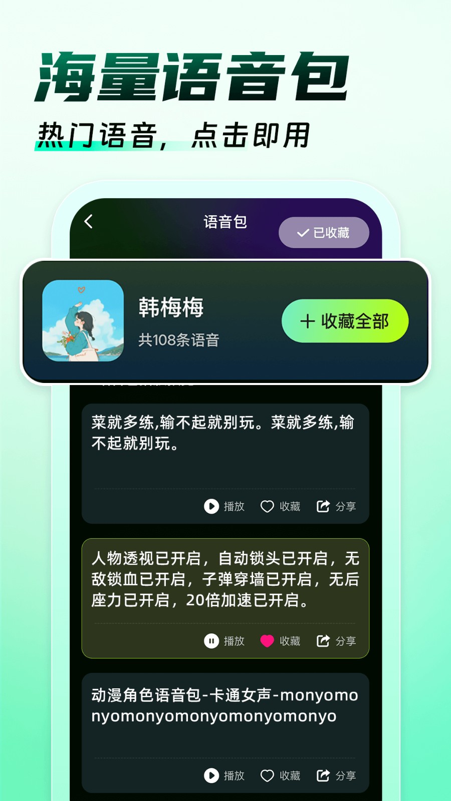 1.涵盖热门声优、搞笑魔性等声线,一键切换即可使用,满足需求。