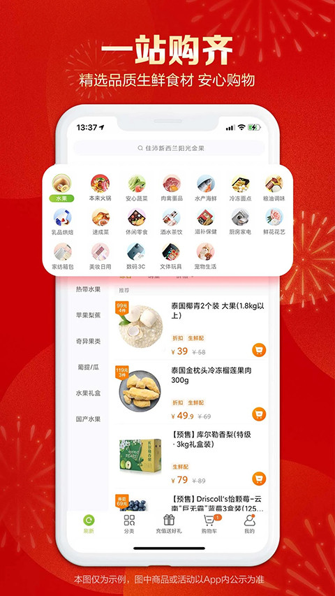 【品类齐全】水果、蔬菜、肉禽蛋、海鲜水产、熟食面点、粮油调味、乳品烘培、休闲零食、酒水茶饮、滋补保健、厨房家电、家纺箱包、鲜花、美妆、数码3C、文体玩具、宠物生活等,一站式备齐所有食材,在家就能享星级大餐