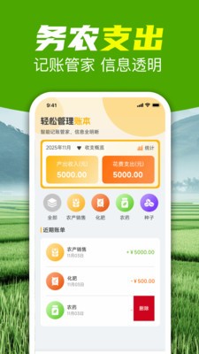 提供有农务记账功能,可以将产出收入、花费支出进行在线记账管理。