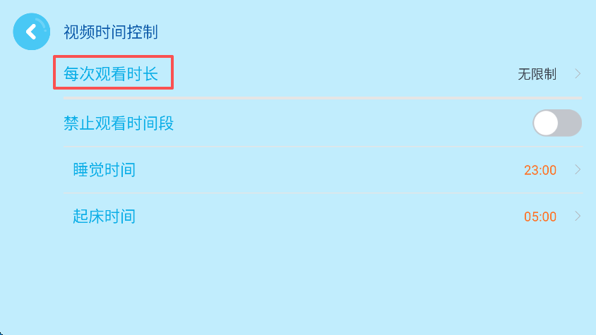4、点击“每次观看时长”,也可以设置禁止观看的时间段。