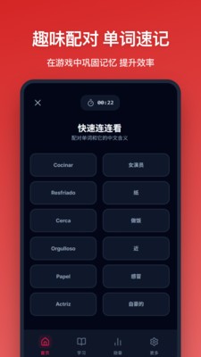 如果你也想学习西班牙语,那么千万不要错过这个西班牙语单词app。软件上有着丰富的西班牙语词汇,你可以随时进行查阅,如果想要背单词也非常方便,软件为用户提供了多种背单词的辅助功能,比如这个单词挑战赛,让你可以用像玩游戏一样背单词,这里还有更多功能等你来体验,感兴趣的话就快来试试吧!