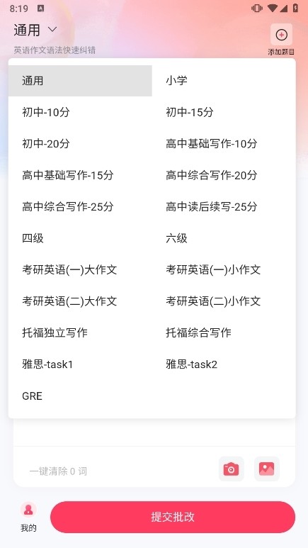 支持初中、高中、四六级、考研、雅思、托福等英语作文的批改。