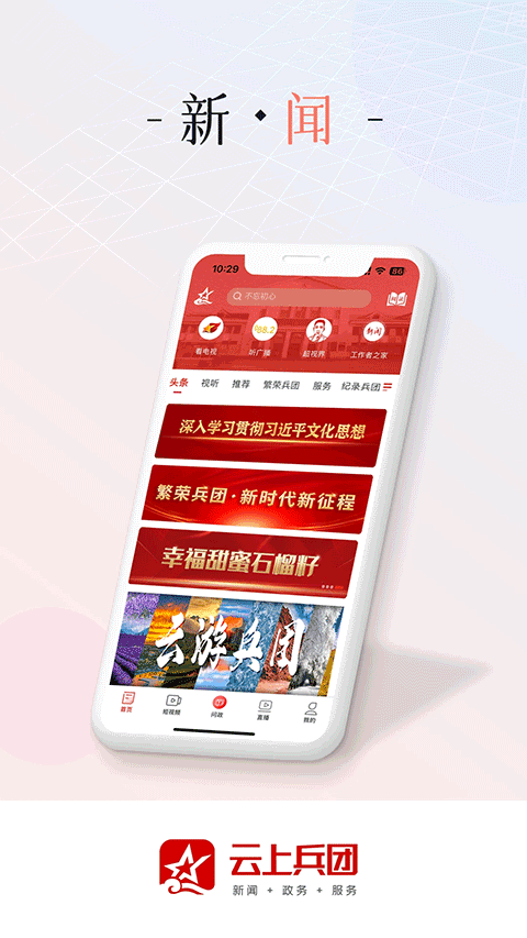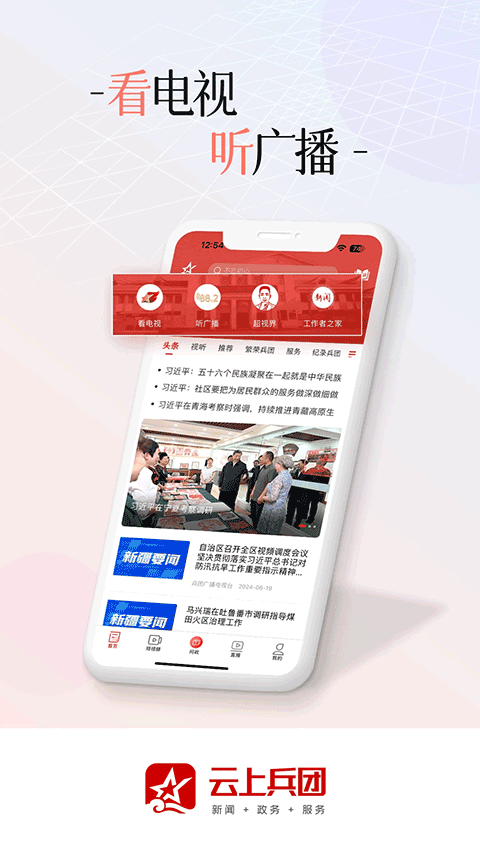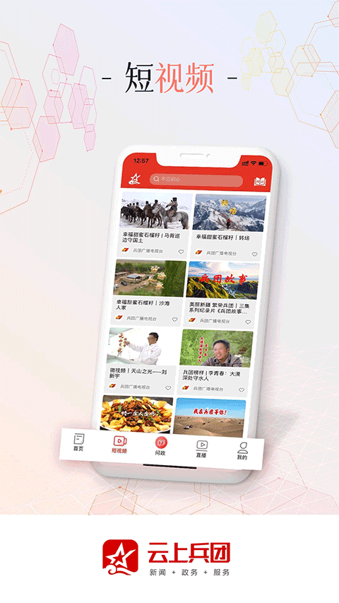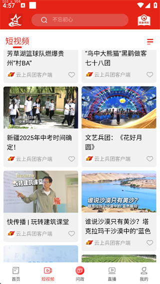 提供电视直播、音频直播、活动直播等功能,用户可实时观看兵团卫视、收听FM88.2兵团综合广播,并参与直播互动。