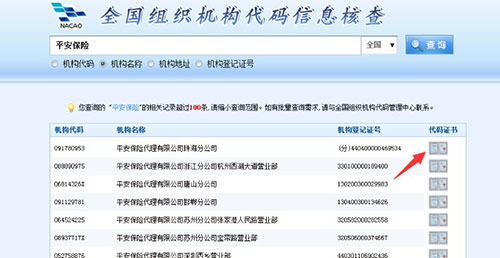 5、此时我们可以看到查询出来的企业,如果搜索的够精确那么直接就可以找到相应的公司,点击右侧的代码证书;