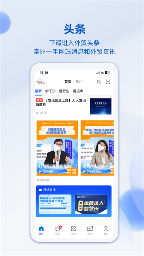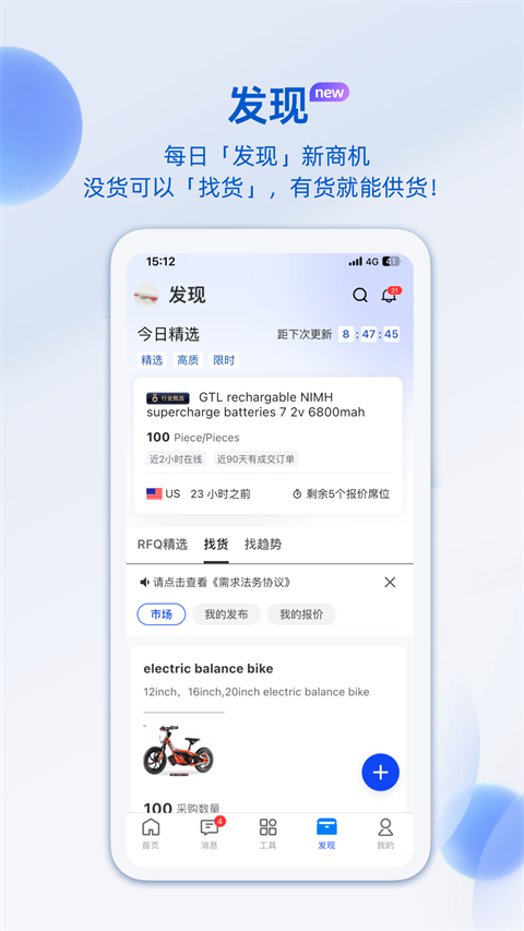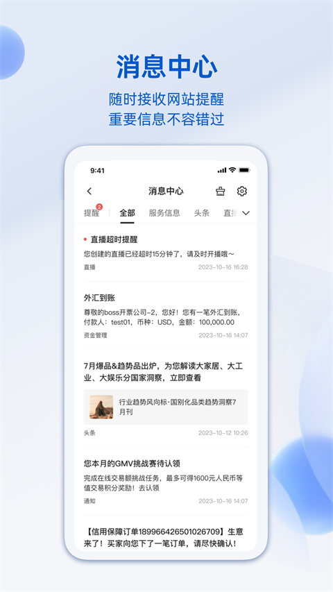 融合了阿里旺旺、外贸邮等功能的阿里卖家APP,实现询盘、采购直达、闪电报价等不同形式客户商机的集中管理,并通过消息提醒助手,实时掌握最新动态;