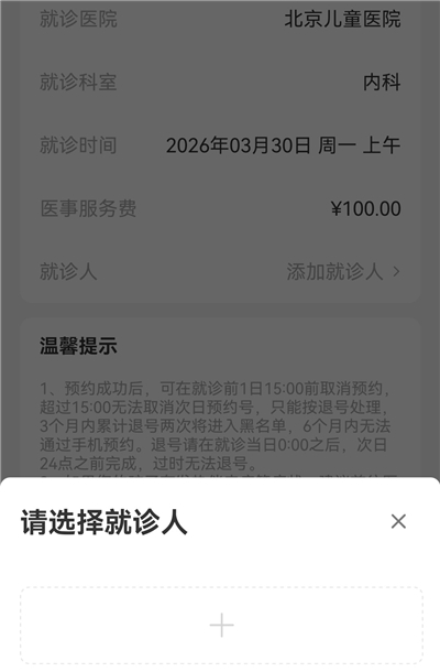 4、在挂号时也能添加就诊人,点击下方灰色的【+】,填写的信息是一样的。