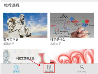 1、首先我们进入到爱课程APP主界面,在该界面点击底端菜单栏中的“我的课程”选项。