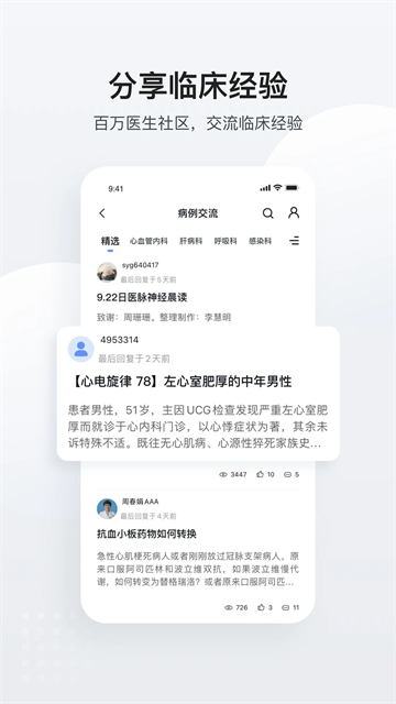 疾病诊疗方法、科室典型病例,疑难病例在线分享,临床医生讨论教学指导,医生社群辅助学习。