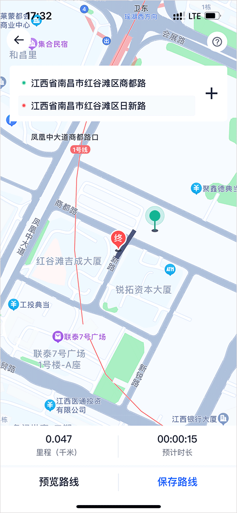3、进入到地图选址页面,点击地图上方的位置即可设置起点以及终点,选择完成后点击右下角的“保存路线”选项;