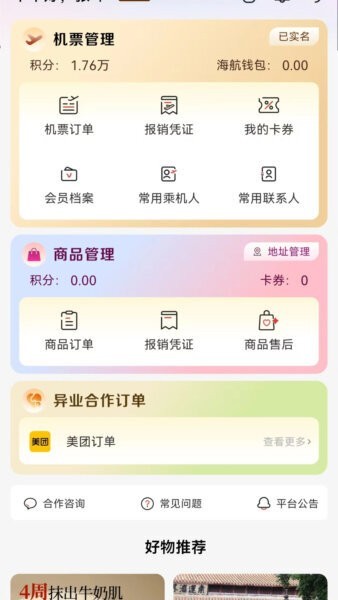 预订完成后,可在“机票管理”中查看订单详情、办理值机、下载报销凭证;商品购买记录可在“商品管理”中查看物流与售后。