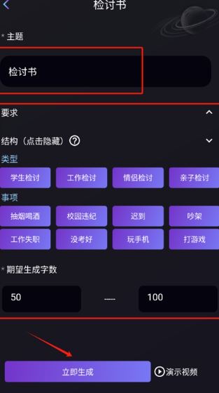 5、点击检讨书,输入主题,选择好检讨书的类型、事项等,点击立即生成,软件会快速为您生成