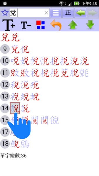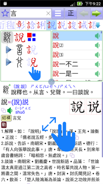 采用〔树状架构〕详细解析单字的字形结构,同时列出〔小篆〕与〔楷书〕互相比对,还可打开每一层来观察偏旁的位置及解析笔画的变化,并且关连到〔词汇列表〕,一个〔点选〕动作即可查看相关的解释,省去繁琐的查询过程,提升学习的效率。
