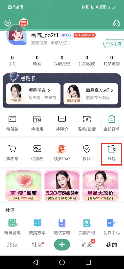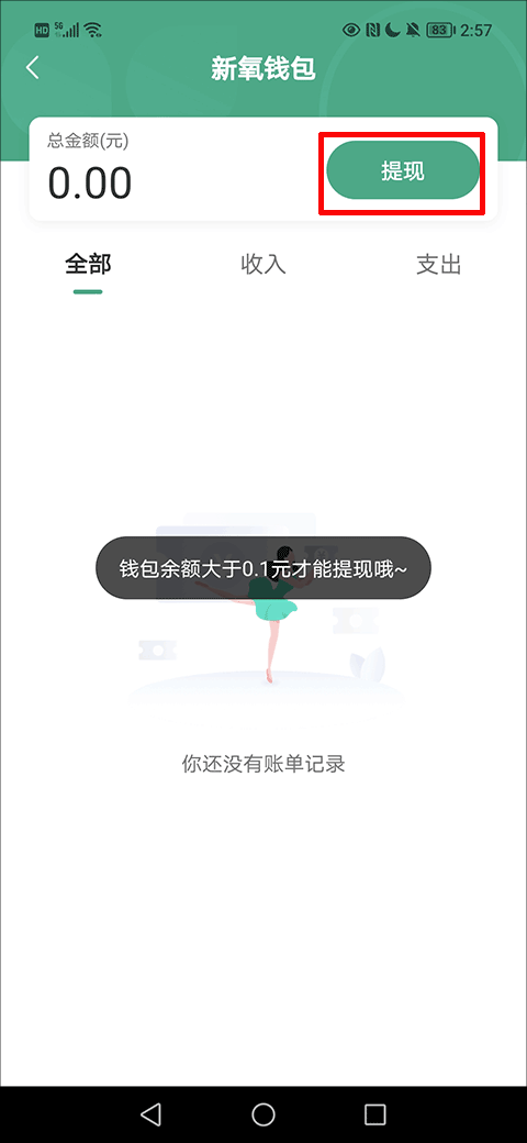 2、在新氧钱包界面选择并点击右上方的“提现”的选项即可开启提现了。