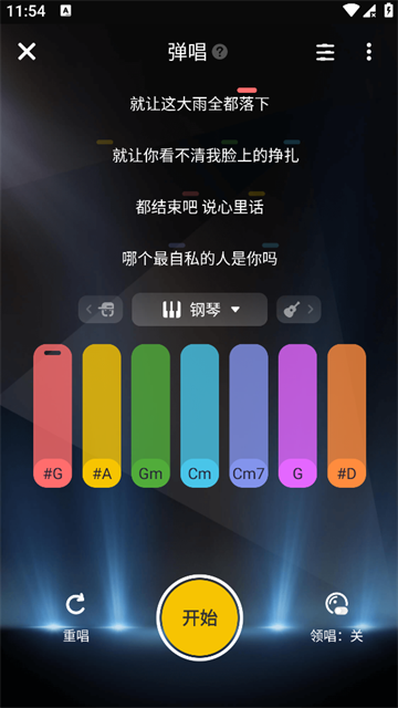 3、正式进入弹唱页面点击中间的开始即可配合乐器按键进行弹唱,如果失误还点击右下角的“重唱”可以重新开始弹唱