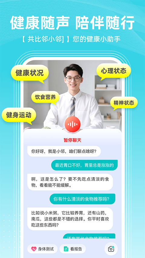 共比邻ai客户端app主要是用来陪伴老年人的软件,该软件拥有语音聊天功能,老年人使用方便,不需要打字,直接发送语音,并且该软件还能为父母制定健康运动计划,并实时播报提醒用户运动、休息等日常生活,有了它的陪伴,让父母的老年生活更加丰富多样,从此不再孤单。