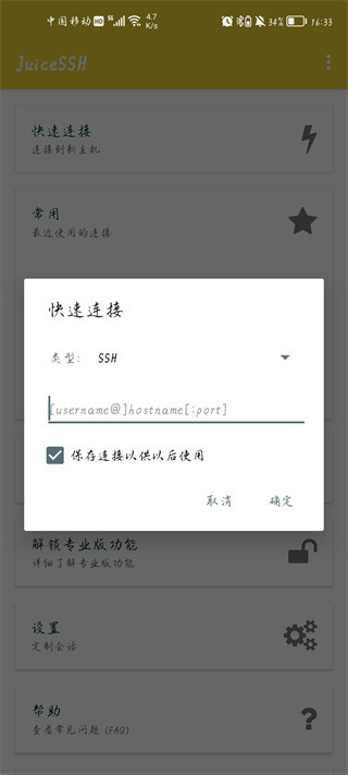 当您处于 JuiceSSH 会话(SSH、Mosh 或 telnet)中时,您可以安全地在应用程序之间切换,JuiceSSH 将使您的 SSH 会话在后台运行。