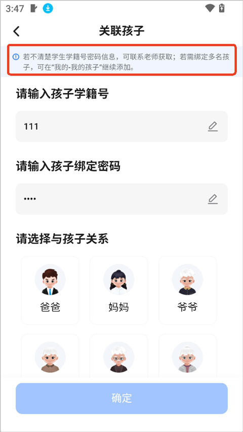若需绑定多名孩子,可在app“我的-我的孩子”继续添加。