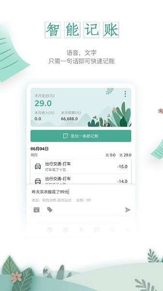 【智能记账】一木记账通过自然语言处理算法,可从一句话识别出账单时间、分类详情、金额等关键信息,通过手动输入或语音输入等方式输入一句话可实现极速记账。