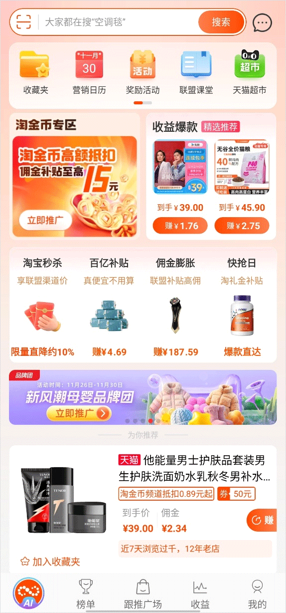 淘宝联盟app是一款电商推广赚钱软件,它是阿里巴巴旗下的软件,目的引导大众帮忙推销产品从而获取收益,软件内提供商品最新动态,帮用户了解市场需求,以便于用户更好的推广赚钱,里面还有很多辅助功能和推广话术,是学生党,上班族,家庭主妇,自由职业者赚取零花钱的首选app。