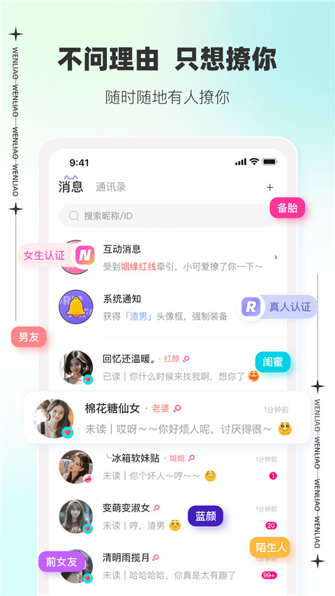 文撩支持建立各种有趣的亲密关系,备胎、闺蜜、秘书等搞怪好玩的亲密关系,支持自定义关系名称,好玩不停~~