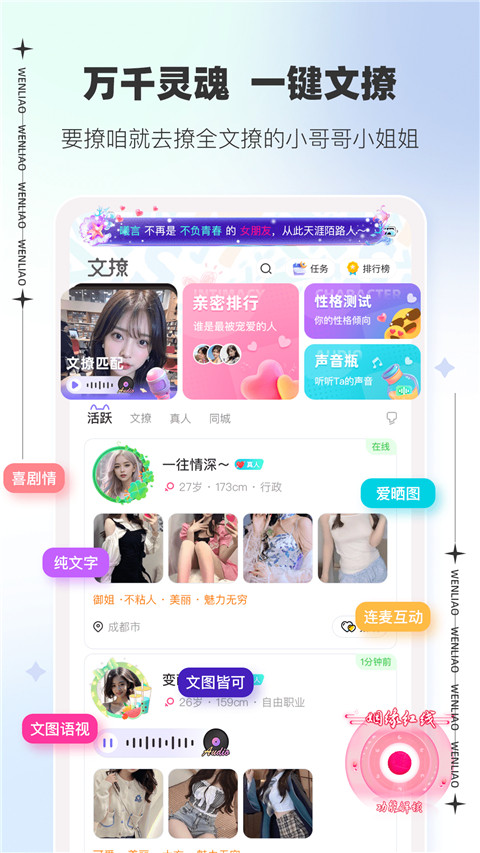 1.精准匹配:根据用户的个人信息和兴趣爱好,文撩app可以精准地推荐与您相匹配的朋友。