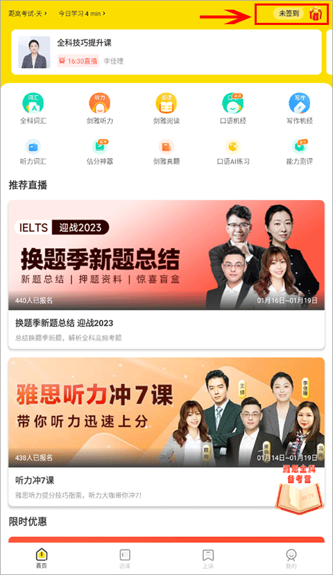 1、首先我们打开土豆雅思app,在选课界面选择你已经报名的课程并点击。
