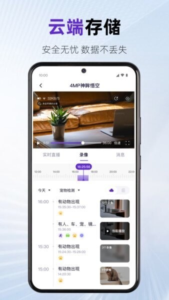 云端存储,数据不丢:支持全天候云录像与事件录像,发生移动侦测时自动上传到云端相册,手机丢了、设备损坏也能通过账号随时找回历史记录。