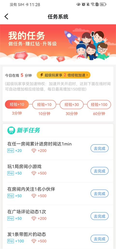 3、在任务页面,每天完成指定任务可以累积在线时长并获得经验,从而提升账号等级。
