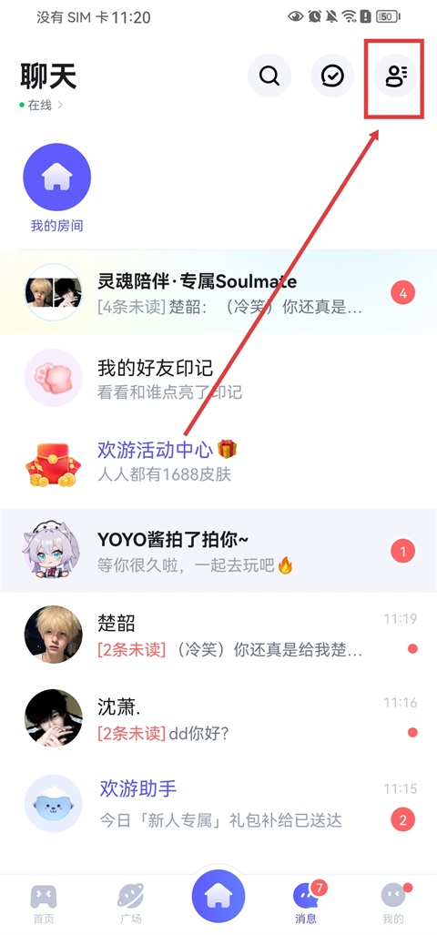 1、打开欢游App,进入【消息】页面,点击右上角人像图标;
