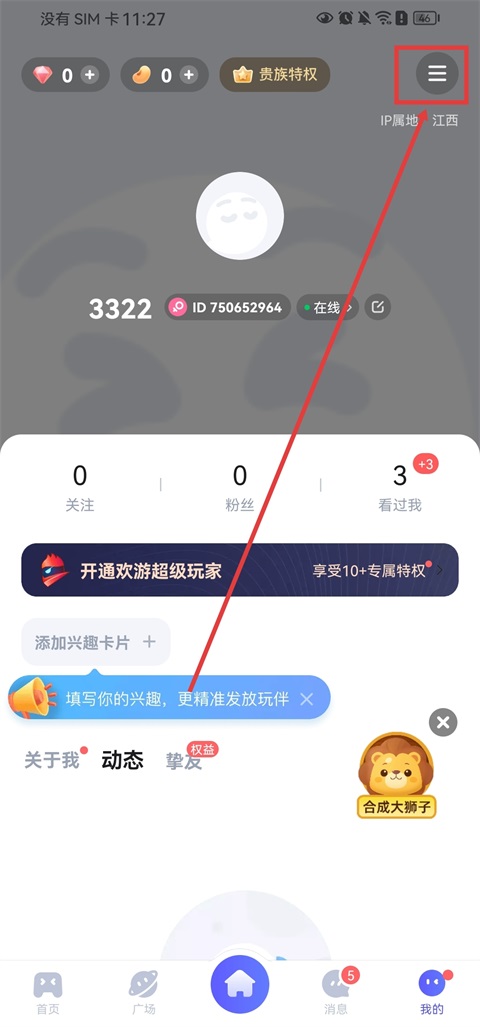 1、进入欢游App的【我的】页面,点击右上角的三横线图标,进入设置菜单;