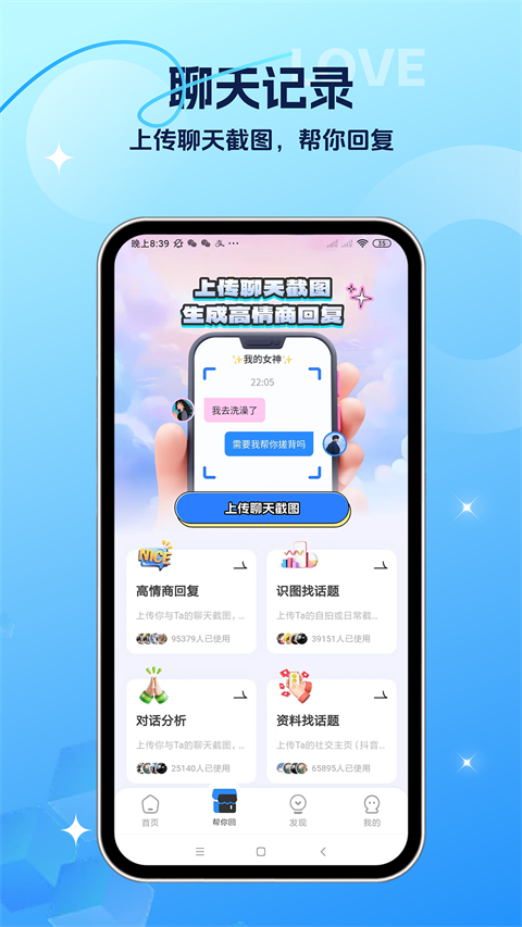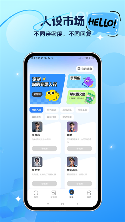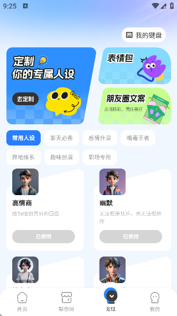 5、然后在【发现】页中则是提供了人设定制,表情包,以及朋友圈文案等热门功能。