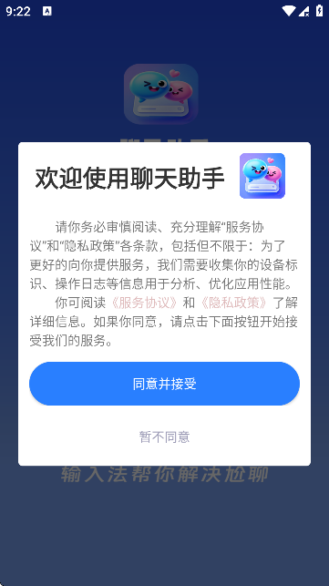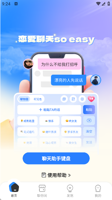3、进入到软件首页,如图所示;这里能为您提供聊天助手键盘,他能帮助你智能的聊天回复。