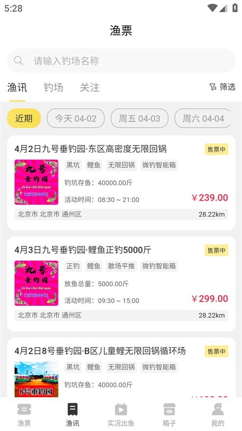 2、进入【渔场】页面,浏览正在开放报名的渔场活动,可通过时间筛选符合自己安排的活动;