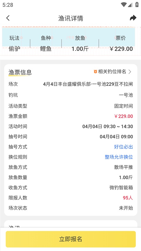3、点击目标渔场,了解活动详情,包括时间、费用、鱼种和规则,确保符合个人需求;
