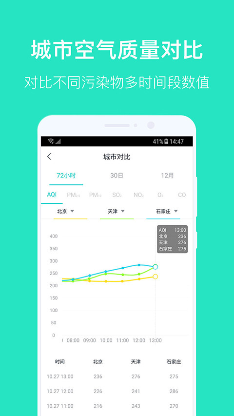 3.城市空气质量状况实时发布:随时掌握关注城市的空气质量情况,向公众提供出行及健康指引,数据更新最及时。