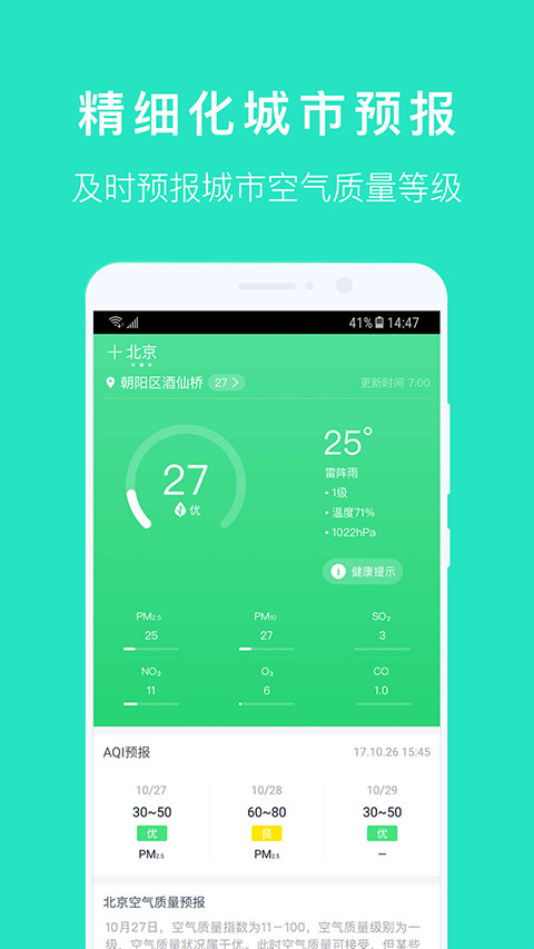 4.精细化城市预报:及时预报城市空气质量等级,发布未来24.48小时空气质量指数范围及首要污染物,转发当地政府发布的预警信息等。