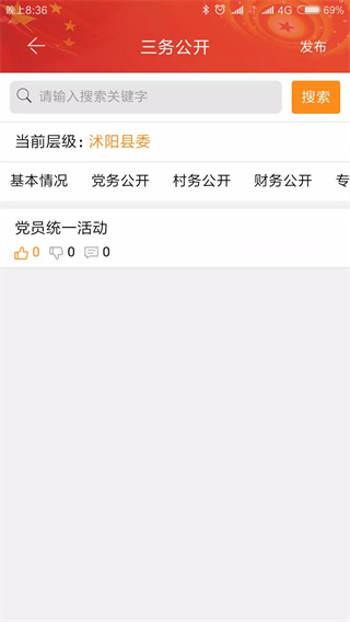 党组织系统管理员可点击右上角“发布”按钮,通过手机将组织生活开展情况拍照上传。