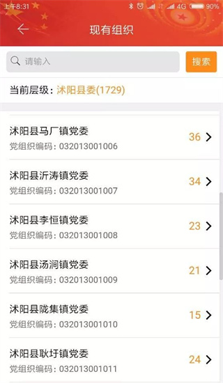 (一)党组织管理用于查询、管理本级及以下党组织信息。左滑查看详情,点击进入下一级。可在搜索框内输入党组织名称进行搜索。