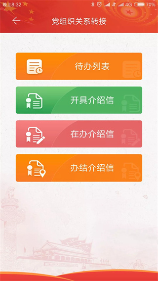 app包含党员的个人信息查看,党费查看,党组织查看,通知公告,党组织可以进行党员关系的处理转接,党员关爱的审批,发布通知公告等,
