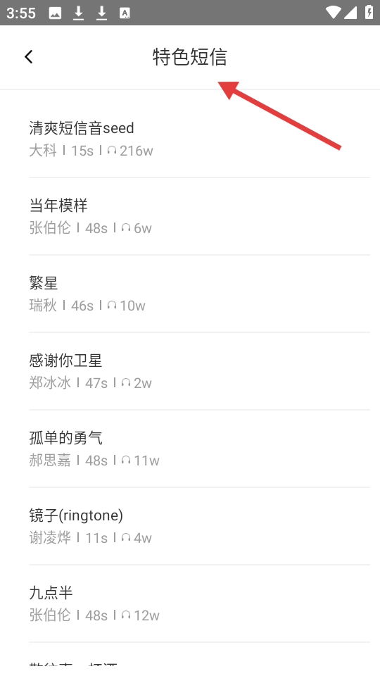 3、特色短信页面陈列多种特色短信铃声,创作者多样,如大科、张伯伦等,满足对短信提示音的个性需求。