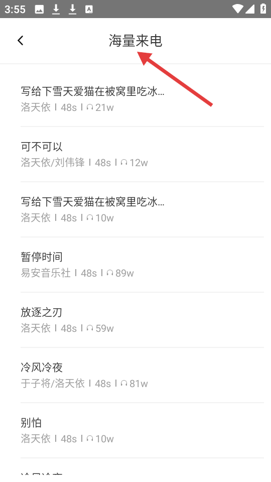 2、海量来电页面,满是来电铃声选项,如洛天依的作品,标注时长与播放量数据,为用户提供丰富选择。