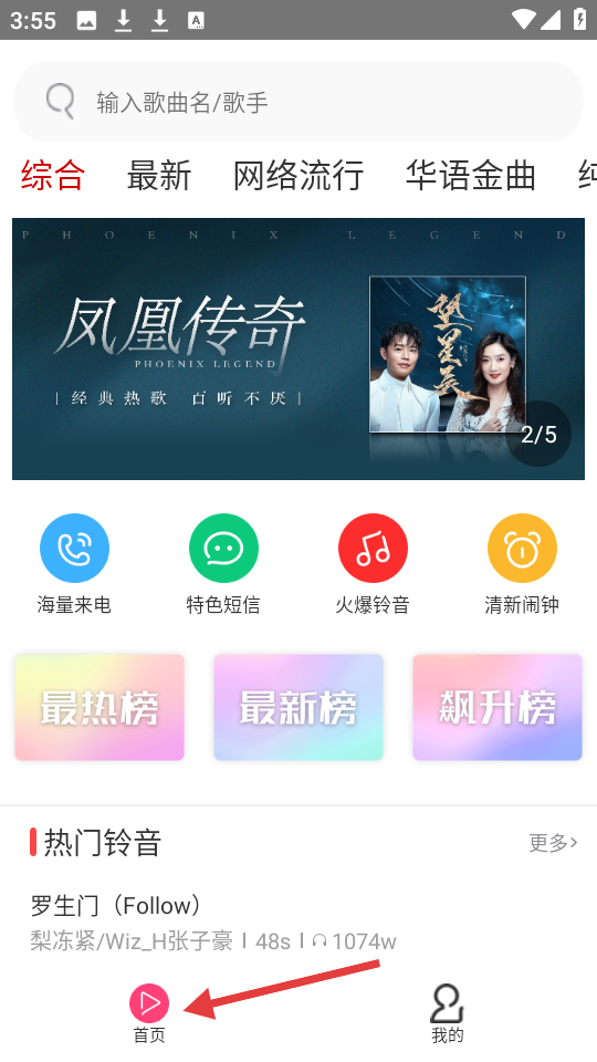1、首页顶部可搜索歌曲,中部有凤凰传奇轮播广告,设海量来电等板块,还展示最热、最新等榜单及热门铃音。