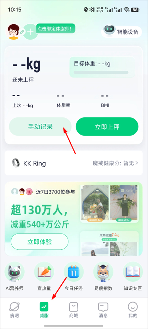 1、打开瘦吧减脂app,进入后点击下方“减脂”再点击“手动记录”;