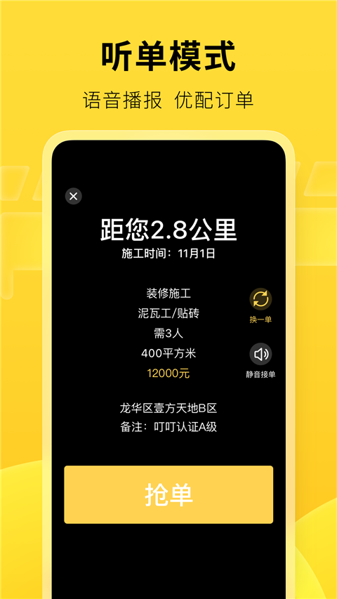 无论你是水电工、泥瓦工、木工、油漆工还是搬运工等等,在这里,你都可以找到你能干的活,语音实时播报,优配订单。