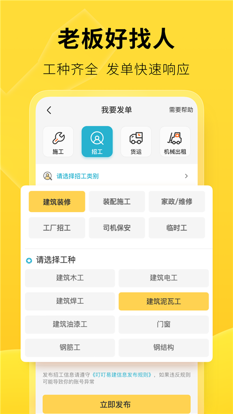 在这里,找建筑工友施工、找机械出租、找运输搬运,通通一键发单全搞定!
