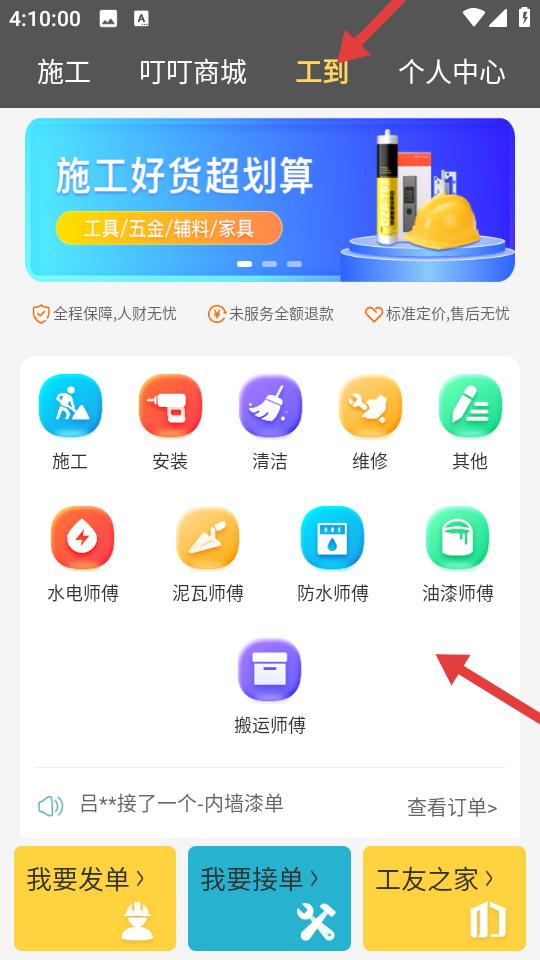 3、切换到工到板块服务图标覆盖施工安装清洁等多类,施工好货商城推广显眼,全程保障售后无忧,水电泥瓦等师傅分类清晰。